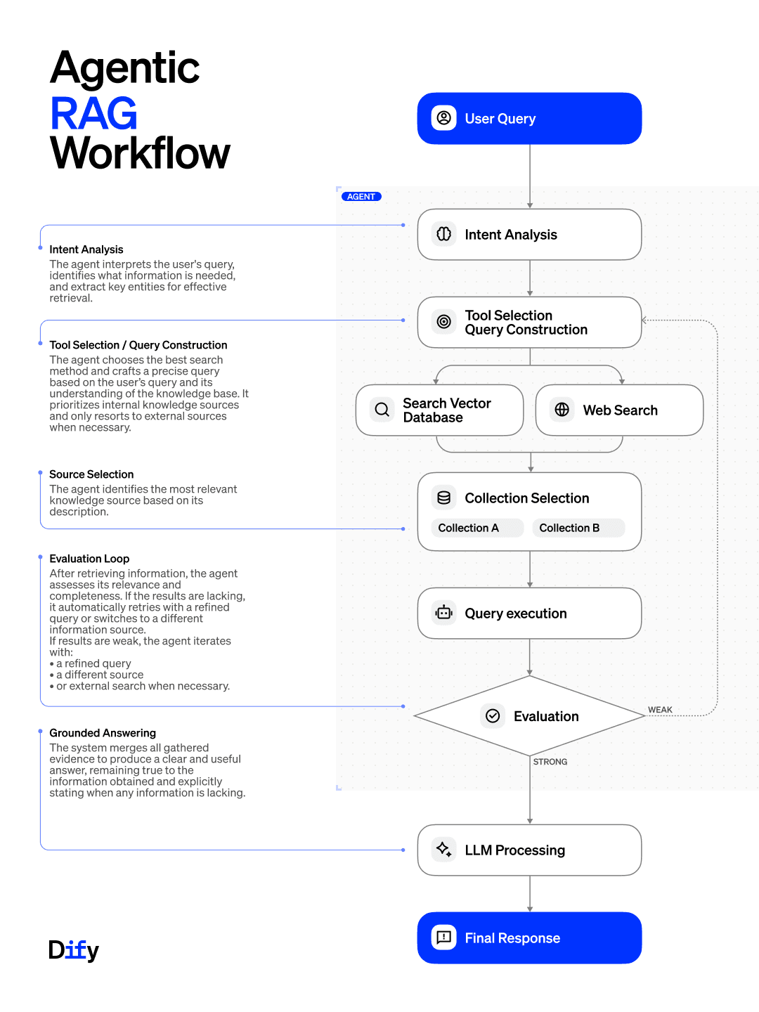 Dify provides a practical framework to implement Agentic RAG through:
