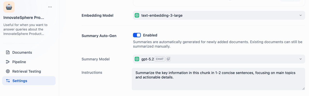 Once configured, use Retrieval Testing in the Knowledge Base to verify that summaries are working as expected.