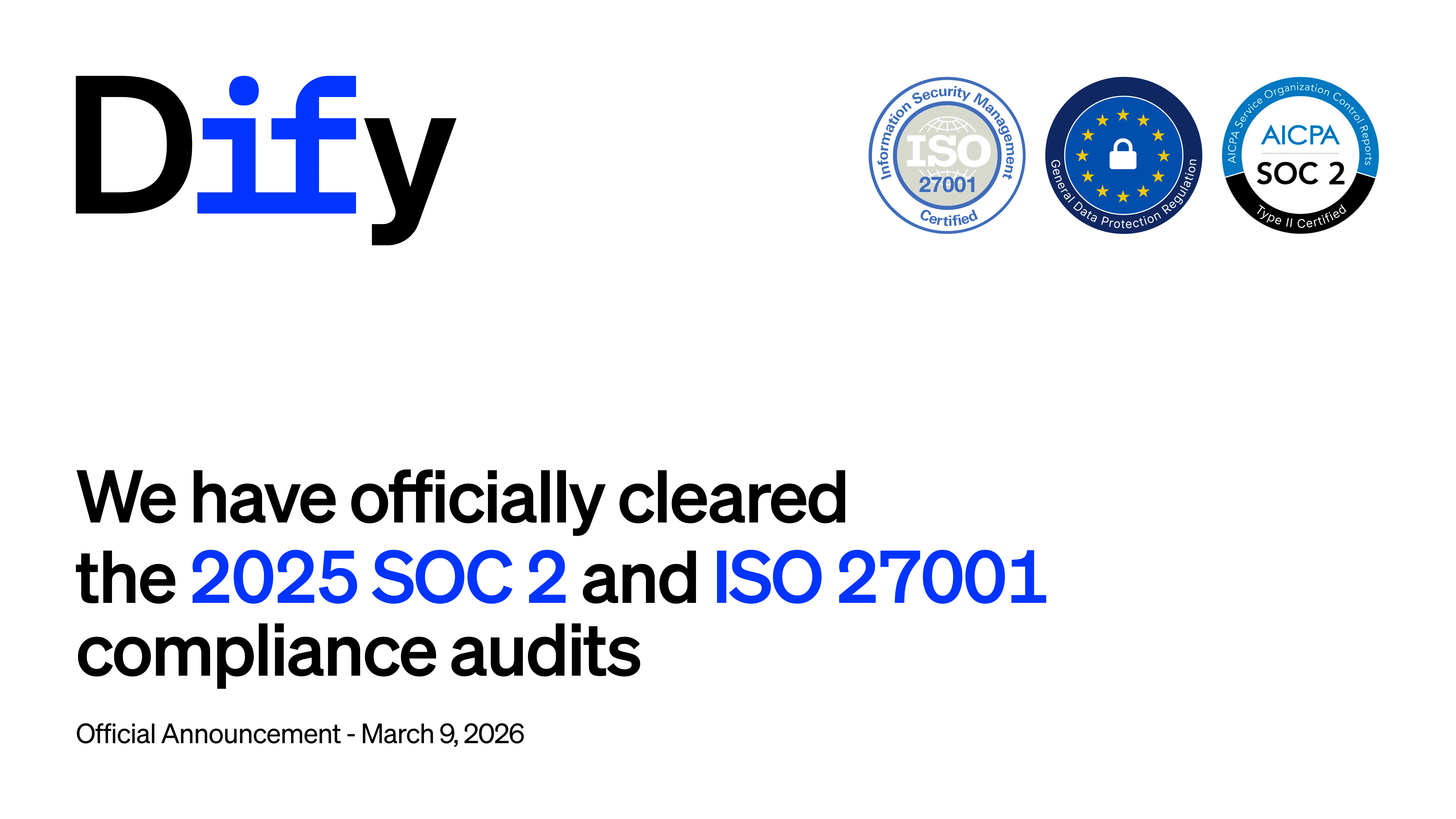 We are pleased to announce that Dify has successfully completed SOC 2 Type II and ISO 27001:2022 audits, as well as GDPR compliance for two consecutive years. This round of audits covered multiple core dimensions, including personnel management, vendor onboarding, data security, system operations, and development security. The auditing bodies expressed strong recognition of Dify's performance across all of these areas. For a company in a stage of rapid growth, maintaining such a mature level of compliance is no small achievement, and this further affirms our steadfast commitment to the security of user data.