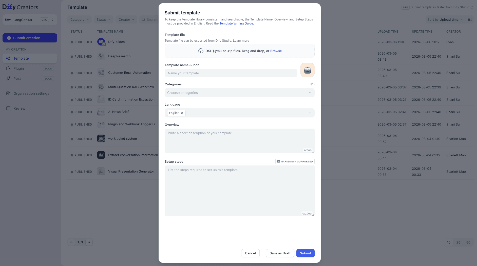 Creators can publish as individuals or organizations. Organization settings allow admins to manage members, invite collaborators, and control template permissions. We welcome partners to create organization accounts to better manage their templates, build enterprise-ready solutions, and gain additional ecosystem support, including featured partner placements and potential joint PR opportunities.