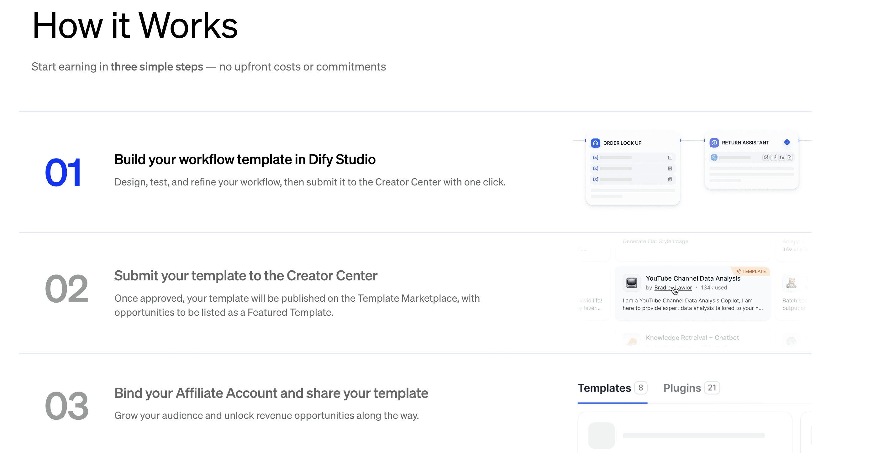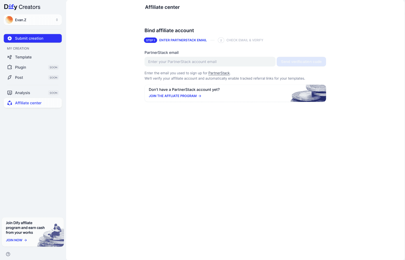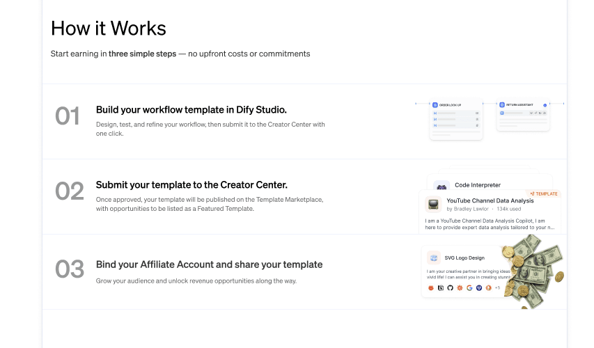 If you join the Dify Affiliate Program and connect your PartnerStack account in Creator Center, you can earn revenue when users subscribe or make payments through your template link.