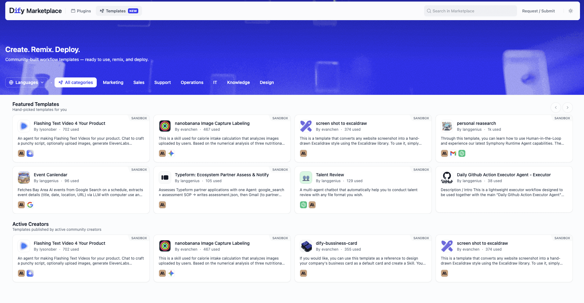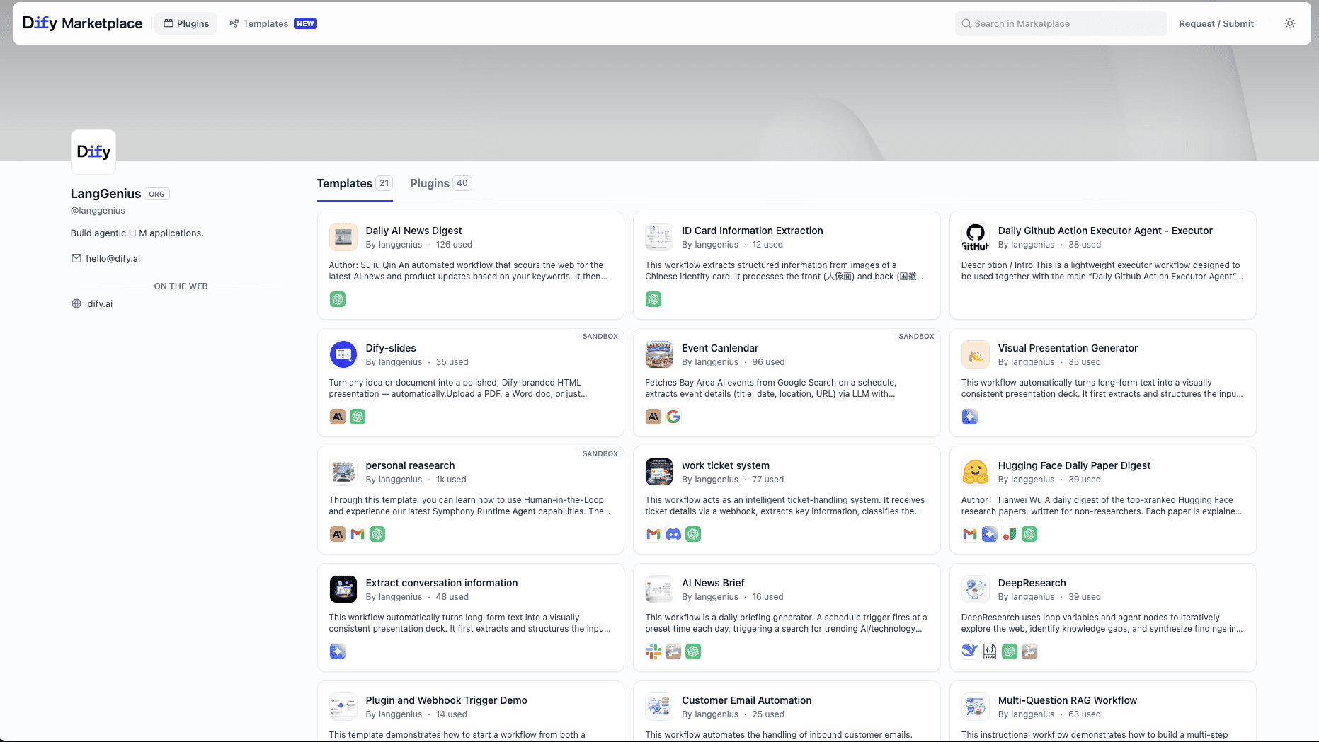 Dify's latest update introduces Creator Center and Template Marketplace, a dedicated platform for creators to publish workflow templates and for users to discover, try, and adopt them in minutes.